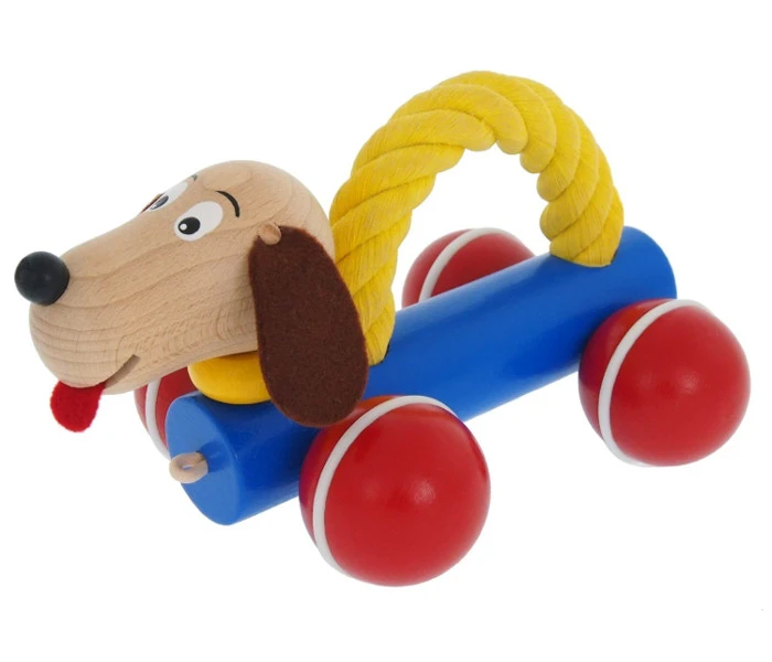 Holztierchen auf Rädern mit dem festen Seil, das in die Kurve gebeugt ist, sind ein sehr praktisches und funktionelles Spielzeug. Sie sind für die Kinder ab einem Jahr bestimmt. Das Seil ist für die Kinderhand ideal angepasst. Das Spielzeug hat eine ausgezeichnete Stabilität. Die Massivräder sind durch starke Achsen durchverbunden.