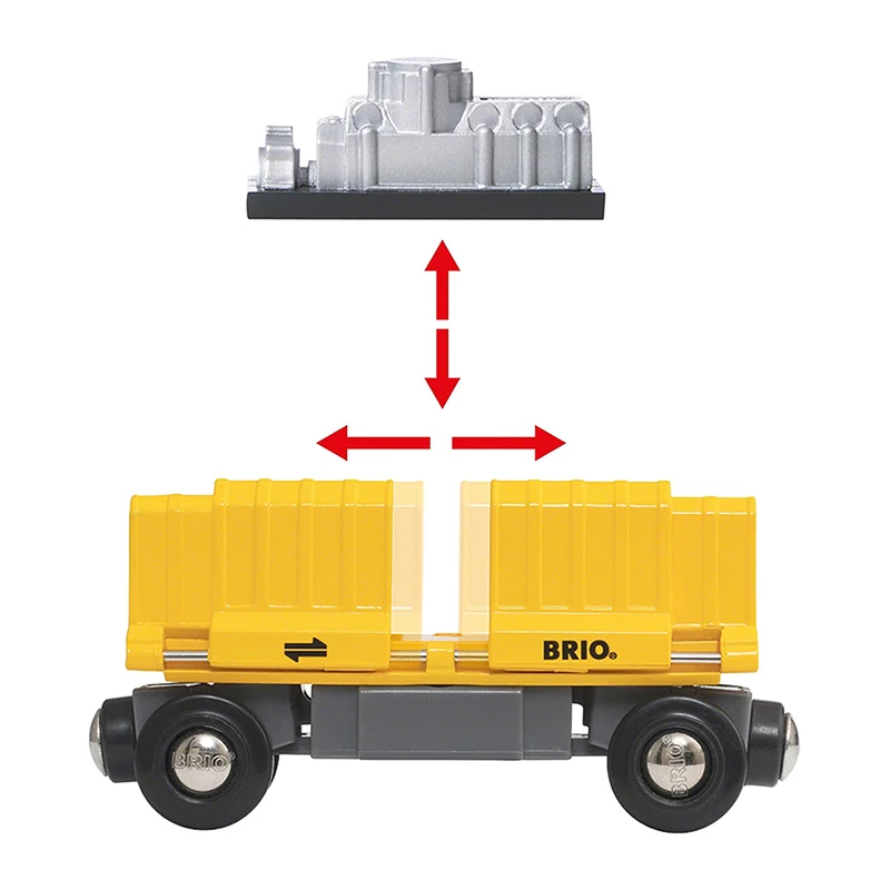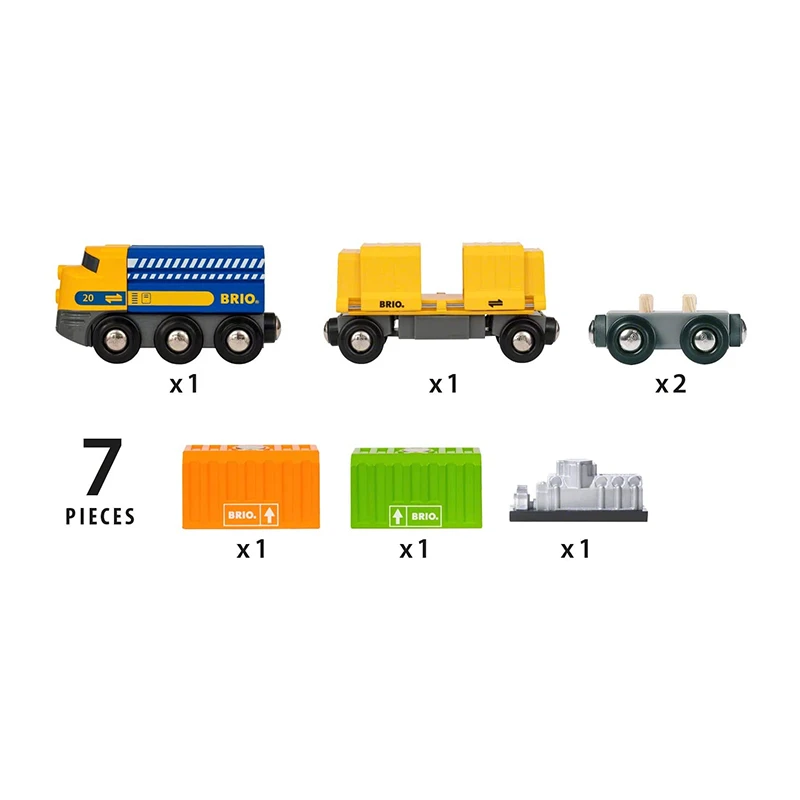 Der extralange Güterzug mit drei Waggons hat gerade den Bahnhof mit sehr viel Ladung verlassen. Dieser knallbunte Spielzeugzug hat drei Güterwaggons – zwei Waggons mit orangefarbenen und hellgrünen Containern und einen speziellen gelben Güterwaggon, hinter dessen Schiebetüren sich ein glänzender, neuer Motor verbirgt. Mit den bekannten BRIO Magnetverbindungen kann dieser Güterzug mit allen anderen BRIO Loks und Waggons verbunden werden.
