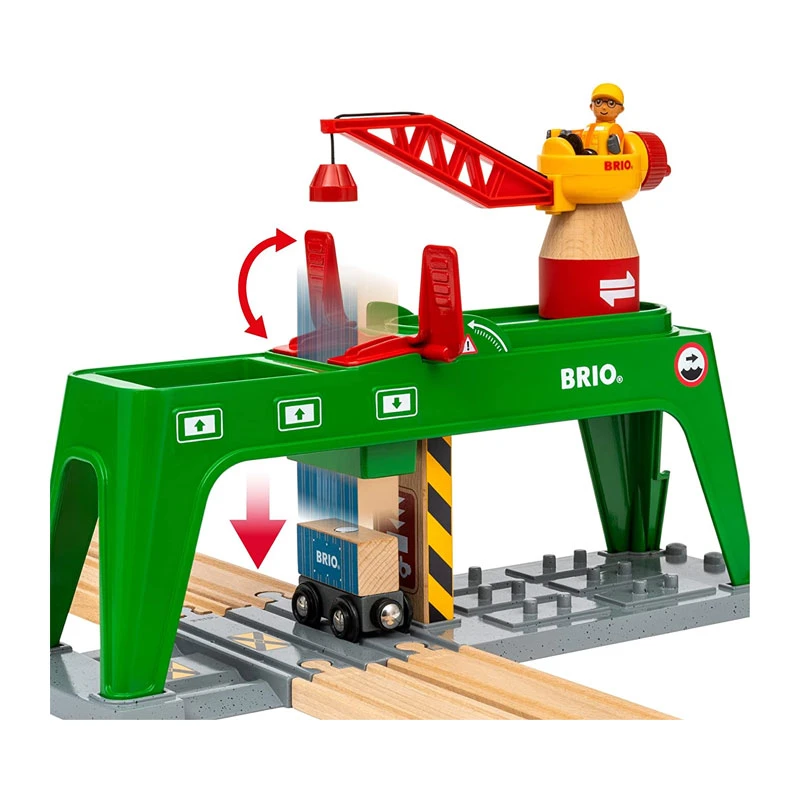 - Mit dem voll beweglichen Holz-Containerkran im BRIO Bahn Verlade-Terminal werden Güter in Windeseile vom LKW oder dem Schiff auf die Eisenbahn umgeladen