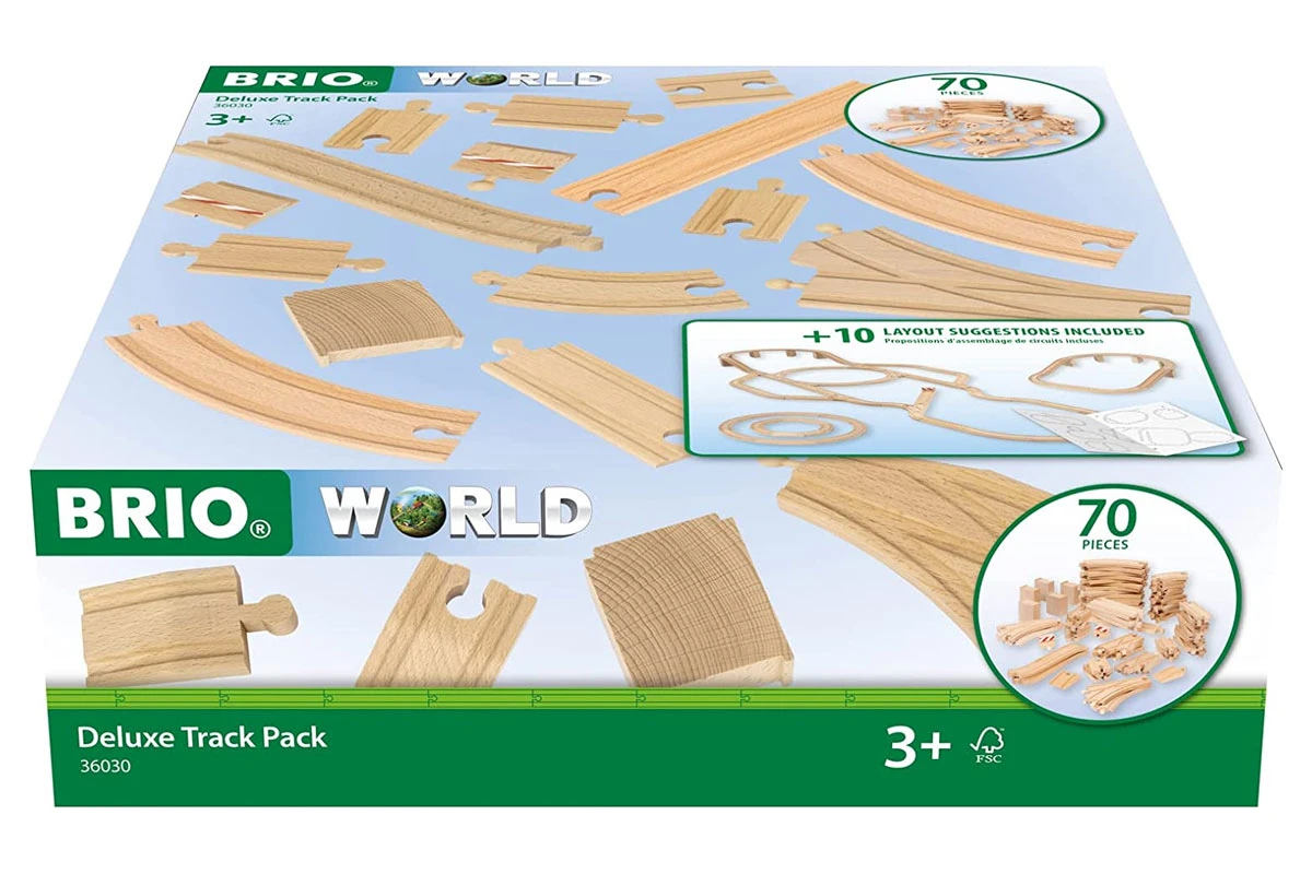Das 70-teilige Schienensortiment Deluxe sorgt für noch mehr kreativen Spielspaß in der BRIO World. Für zusätzliche Inspiration sorgt der beigelegte Flyer mit verschiedenen Strecken-Optionen. BRIO-Spielwaren tragen das FSC-Label und enthalten ausschließlich Holz aus nachhaltiger Forstwirtschaft.