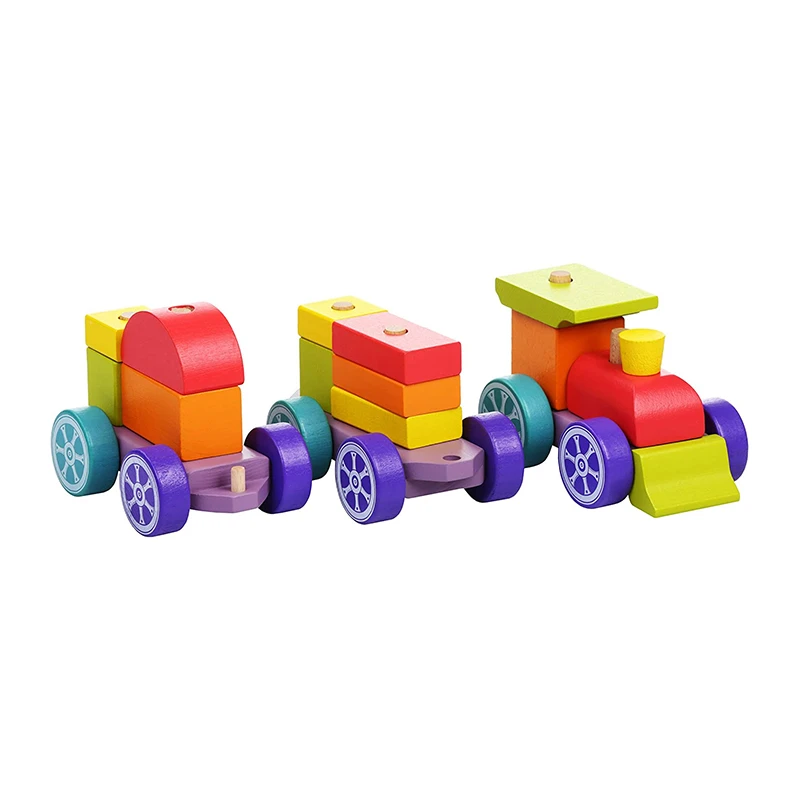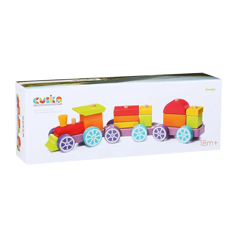 Der Holzzug enthält eine Dampflok und zwei mit einer Schnur aneinander befestigte Flachwagen sowie acht farbige Elemente, die nach dem Pyramidenprinzip an den Flachwagen befestigt sind. Die Räder sind beweglich. So kann Ihr Kind die Bewegung eines Zuges nachahmen. Macht Ihr Kind mit Farben vertraut, entwickelt motorische Koordination, Vorstellungskraft und Feinmotorik.
