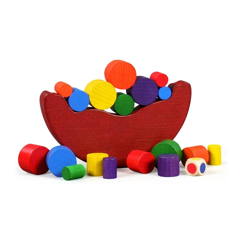Immer wieder werden Holzrollen (mit Farbwürfel ausgewählt) auf die Schaukel gelegt. Wenn es umkippt hat man verloren!