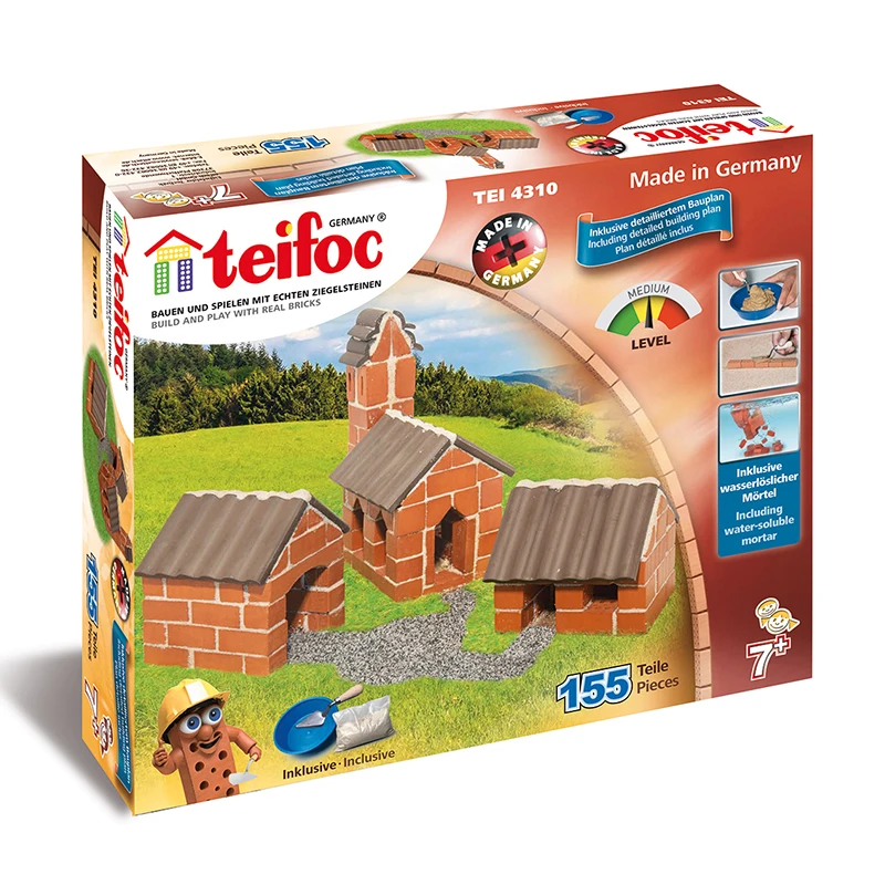 Das wunderschöne teifoc Dorf besteht aus 3 einzelnen Gebäuden – einem Einfamilienhaus, einer Scheune und einer Kirche. Die Kirche besteht traditionell aus Glockenturm und Kirchenschiff und passt gut in jedes Modellbaudorf. Im Set enthalten sind eine ausführliche Bauanleitung, Mörtelschale, Maurerkelle, Ziegelsteine, Bodenplatte und Mörtel. Langanhaltender Spielspaß durch unzählige Kombinationsmöglichkeiten innerhalb der teifoc Spielwelt, da alle Bauteile miteinander kombinier- und erweiterbar sind. Das Spielen mit den teifoc Produkten fördert die Feinmotorik, sowie logisches und räumliches Denken. Dieses Produkt ist für Kinder ab 7 Jahren geeignet.