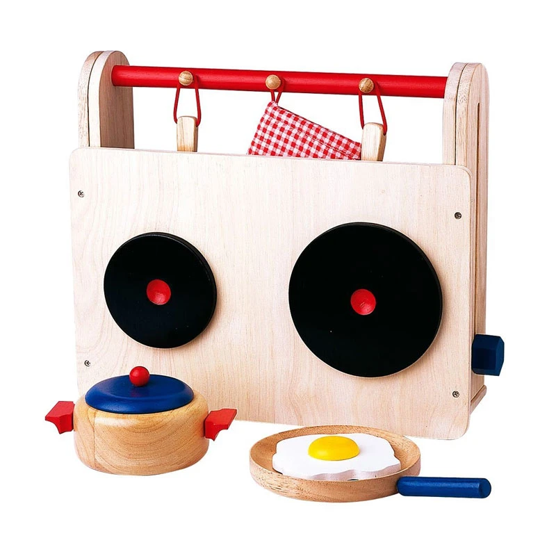 - Zweiplattenherd mit Pfanne und Spiegelei, Suppentopf, Topflappen und Kochbesteck.