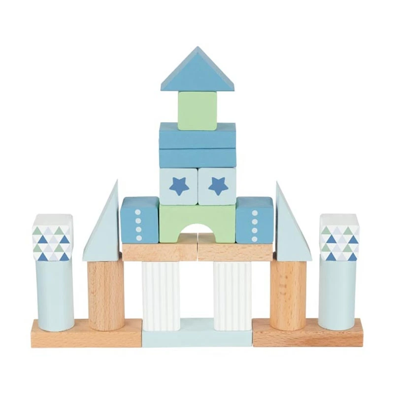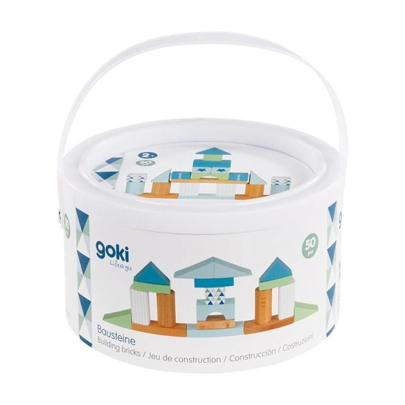 Die Farbwelt macht aus den 50 Buchenholzbausteinen etwas ganz Besonderes. Und damit kein Stein verloren geht, liegt dem Set ein Baumwollbeutel zur einfachen Aufbewahrung bei.