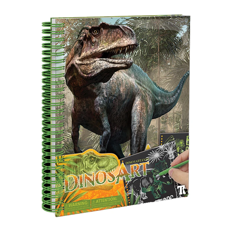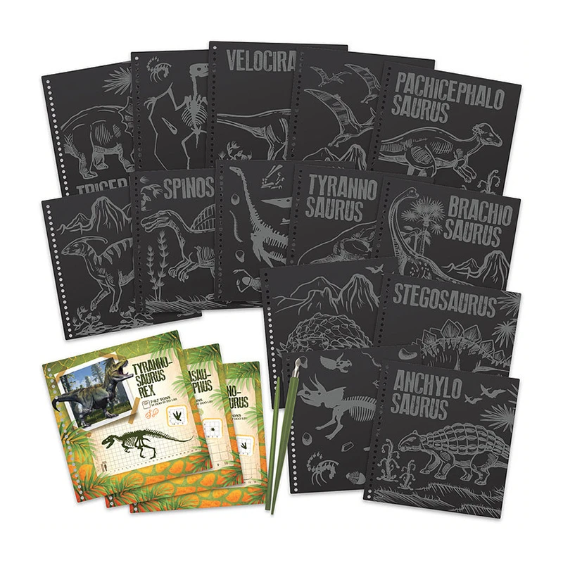 Vierzehn Dinosaurierbilder warten darauf, von kleinen Künstlern enthüllt und verschönert zu werden.