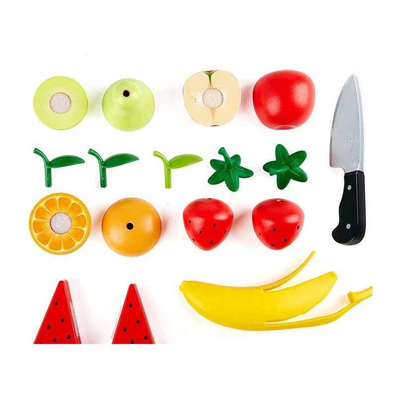 - enthält zwei Erdbeeren, eine Birne, eine Orange, einen Apfel, eine Wassermelonenscheibe, eine Banane und ein realistisches Spielmesser