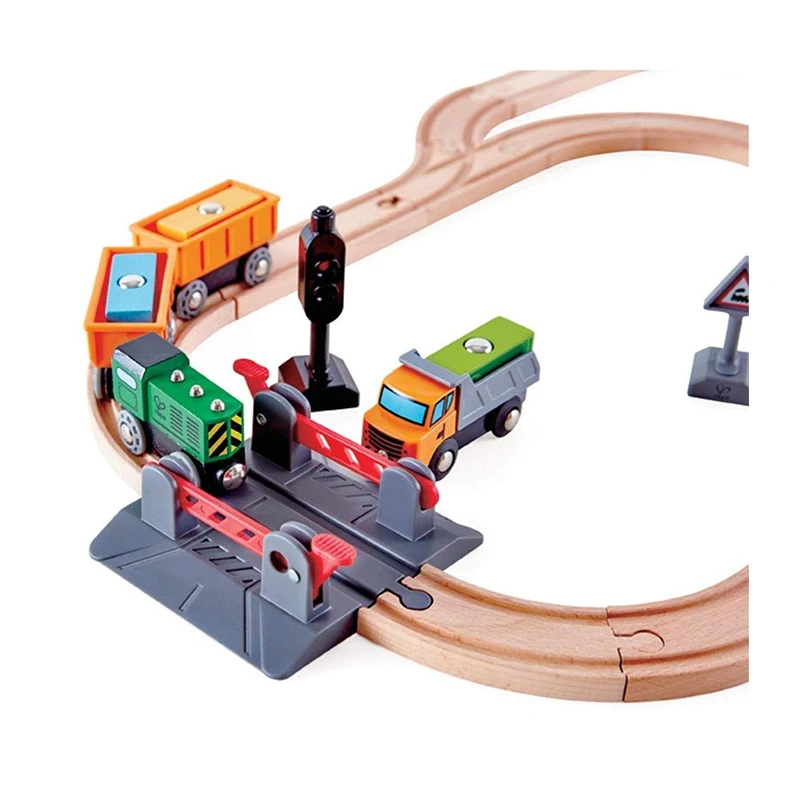 - Enthalten sind Bahnübergang, Schienen, Kran-Set, Güterzug, Kipplaster und einstellbare Sicherheitssignale