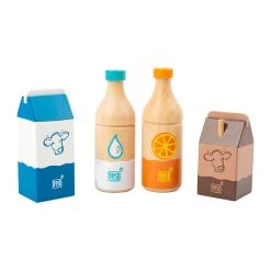Dieses vierteilige Getränke-Set aus Holz beinhaltet eine Flasche Orangensaft, eine Flasche Wasser, eine Tüte Milch und ein kleines Trinkpäckchen Kakao. Durch die Gestaltung mit einfach verständlichen Abbildungen sind sie perfekt für kleine Kinder, die noch nicht lesen können. Eine ideale Ergänzung für Kaufmannsladen und Kinderküche! In produkttypischen Farben gestaltet und mit einem hohen sichtbaren Holzanteil, gibt dieses Spielset ein harmonisches Erscheinungsbild ab und reiht sich optisch in die Produktgruppe „Fresh“ ein.