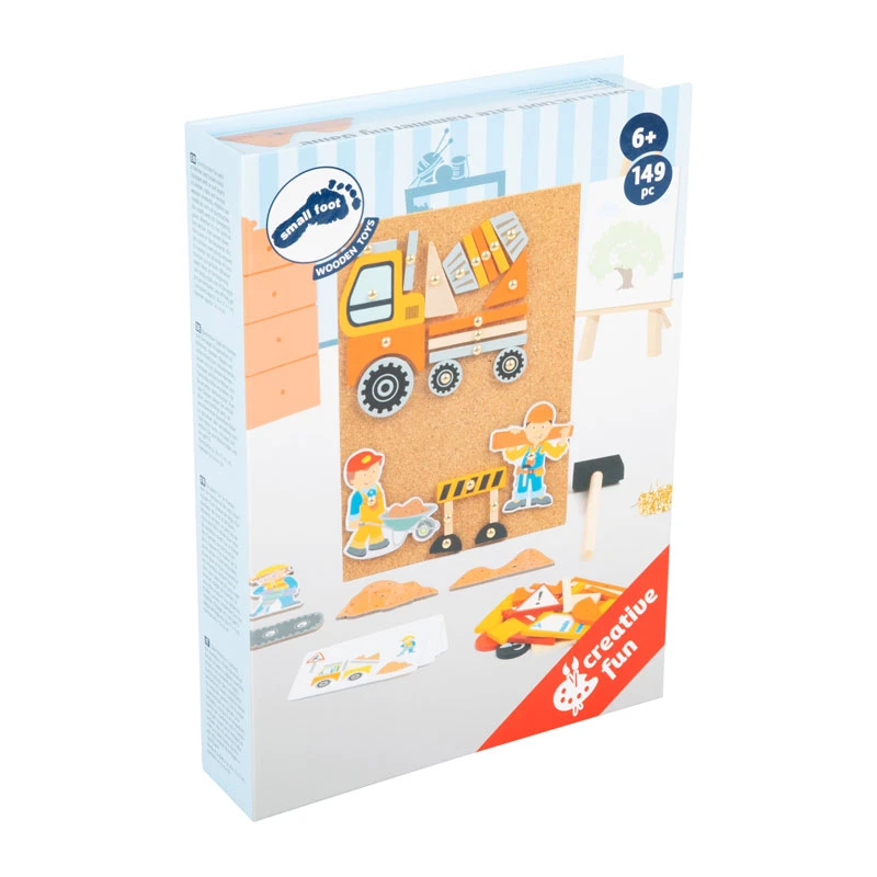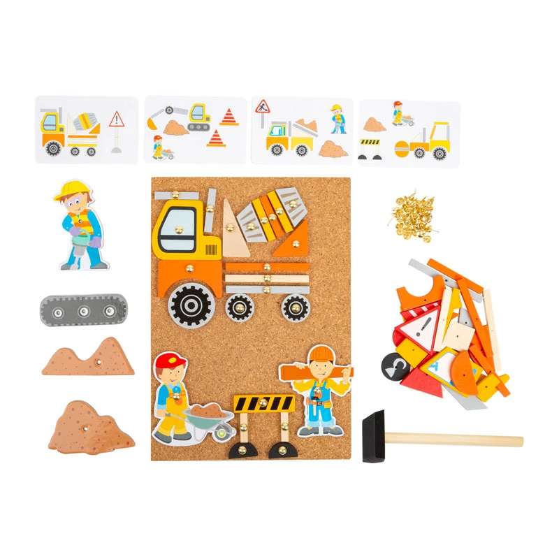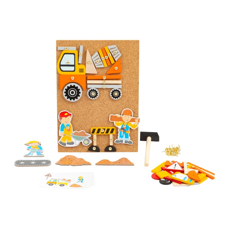 Baustellen-Spaß mit Hammer und Ziernagel! Ausgestattet mit Korkbrett, Hammer, Nägeln und unterschiedlichen Holzelementen, lassen sich mit diesem Hämmerchenspiel zahlreiche Motive zum Thema Baustelle erschaffen. Ob Bauarbeiter, Betonmischer, Kran oder Bagger, dieses Set enthält alles, was benötigt wird, um verschiedenste Baustellen-Bilder zu gestalten. Wer am Anfang noch nach Ideen sucht, schnappt sich einfach die acht Bildvorlagen und los geht’s! Dieses Geschicklichkeitsspiel fördert die Kreativität und gibt Raum für eigene Kreationen und Bilder. Verpackt in einer praktischen Box, kann nichts verloren gehen.