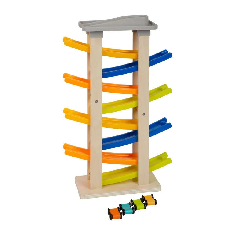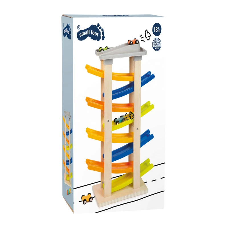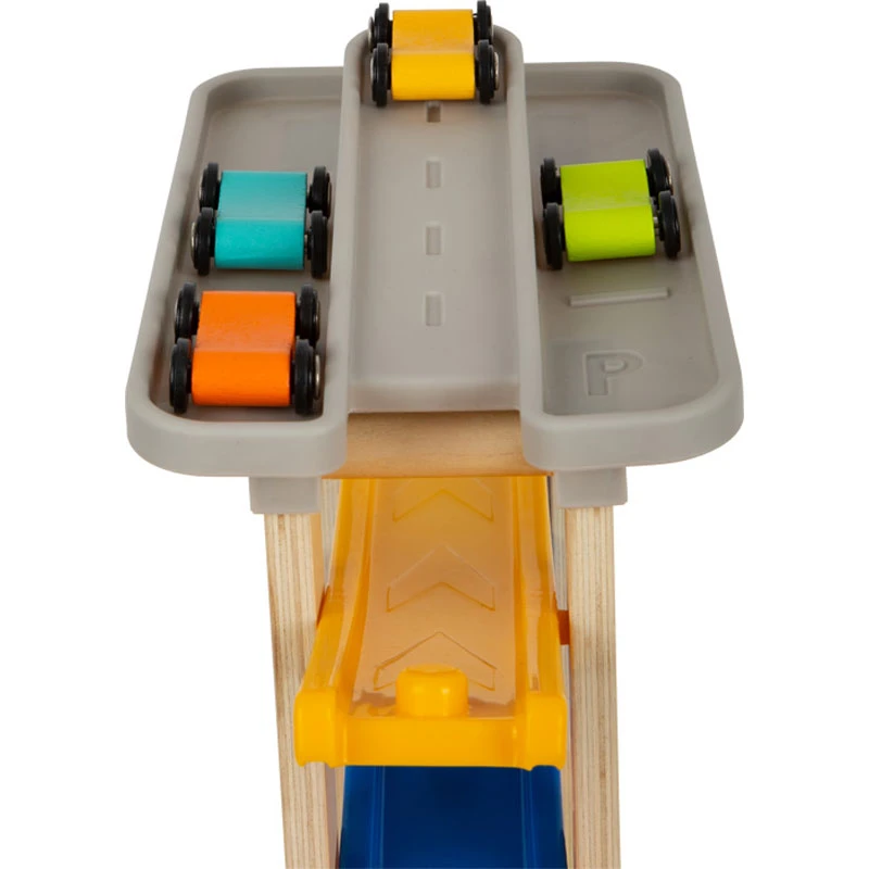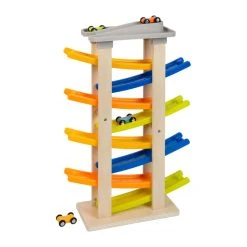 Auf los, geht’s los! Mit Tempo flitzen die vier Rennautos die extrahohe Klick-Klack-Rennbahn aus naturbelassenem Holz mit stabilen Kunststofframpen hinunter. Acht Rampen und eine Straßenabfahrt sorgen dabei für ein extralanges Fahrvergnügen. Das hochgelegene Parkdeck mit vier Stellplätzen bietet vor und nach der wilden Fahrt ausreichend Parkfläche für die farbigen Holzautos. Mit stabilem Fuß für einen sicheren Stand!