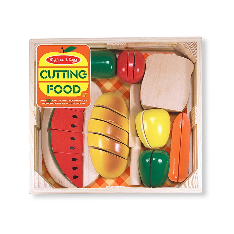 Dieses hölzerne Spielnahrungsset ist perfekt für junge Köche, die ein wenig Spaß beim Essen haben möchten – ohne die Unordnung! Es enthält acht Holzstücke, die in 27 Abschnitte geschnitten werden können, ein Schneidebrett und ein Holzmesser. Das Schneiden des Essens macht einen befriedigenden „Crunch“ – und bietet eine spielerische Einführung in die Konzepte von „Ganzem“, „Teil“ und Brüchen.