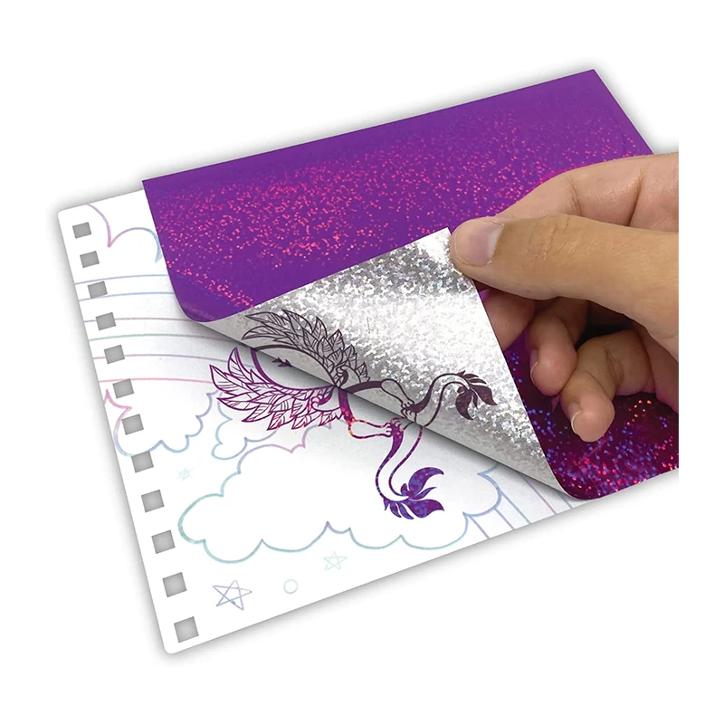 Übertrage die Folienpapiere auf die selbstklebenden Zeichnungen, um glitzernde Meisterwerke entstehen zu lassen. Die Technik ist ganz einfach – das Ergebnis dafür umso spektakulärer!