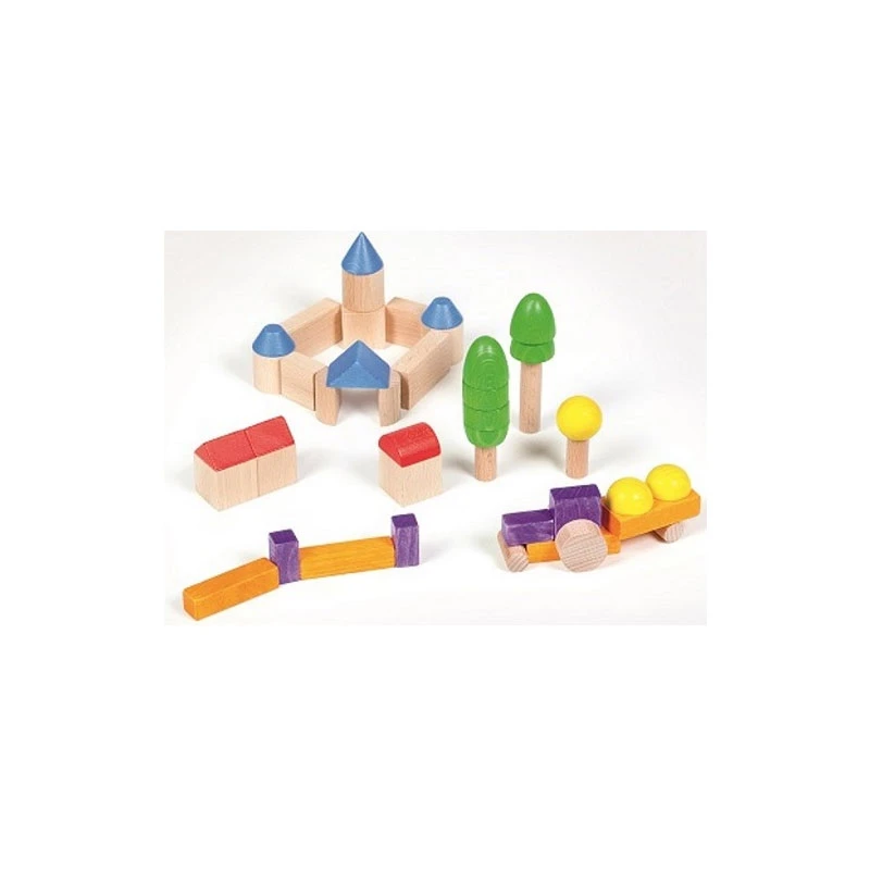 Die kleine Bauspielwelt besteht aus den klassischen Fröbel-Grundkörpern Kugel, Walze, Würfel und deren Teilungen ergänzt durch Scheibe, Halbkugel, Kegel, Kegelstumpf, Paraboloid und Paraboloidstumpf. Neben dem freien Bauen können die Kleinen auch exakt nach Raster gestalten und planen. Dabei dient die mitgelieferte Rasterfolie als Kopiervorlage. Gerade bei dieser Spielvariante lernen Kinder die mathematischen Bezüge der einzelnen Formen zueinander besser zu verstehen.